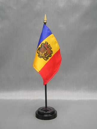 4x6" desk flag of Andorra. Printed on silk-like material, fully hemmed on all four sides and stapled to a 3/16"x10" ebonized plastic staff with a 1" gold-colored spear-point finial. Base sold separately.
