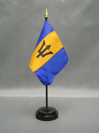 4x6" desk flag of Barbados. Printed on silk-like material, fully hemmed on all four sides and stapled to a 3/16"x10" ebonized plastic staff with a 1" gold-colored spear-point finial. Base sold separately.