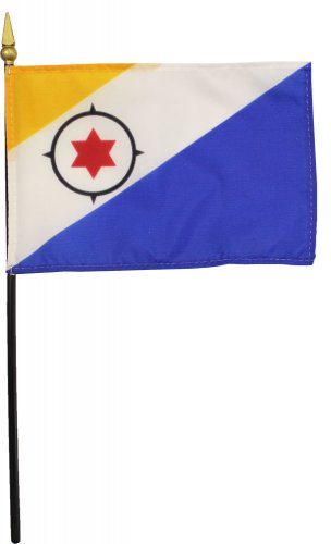 4x6" desk flag of Bonaire. Printed on silk-like material, fully hemmed on all four sides and stapled to a 3/16"x10" ebonized plastic staff with a 1" gold-colored spear-point finial. Base sold separately.