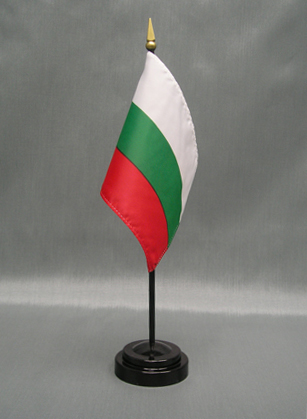 4x6" desk flag of Bulgaria. Printed on silk-like material, fully hemmed on all four sides and stapled to a 3/16"x10" ebonized plastic staff with a 1" gold-colored spear-point finial. Base sold separately.